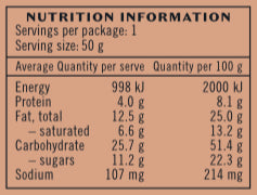 Apricot + Chocolate Ingredients - Cereals 36% [flour, rolled oats, steel cut oats], Dark Chocolate 15% [sugar, vegetable fat, cocoa powder, emulsifiers (322, 492), flavours], Margarine [vegetable fat, water, salt, emulsifiers (471, 322), antioxidant (307b), food acid (330)], Golden Syrup, Dried Apricots 12%, Coconut Oil, Chia Seeds, Flax Seeds, Brewers Yeast, Emulsifier [soy lecithin], Salt