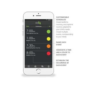 Ooly gives you a lot of control over the settings and schedule. You can program everything according to your own preferences. You can cue a light setting with any particular days/times you choose. The default settings do not use blue light (which parents love) and you can pick your own colors. For example, you can set yours for “getting ready for bed” (yellow), “bedtime” (purple), “almost time to wake up” (green), and “time to wake up!” (blue), but you could also sync it for nap times, or mealtimes, or even potentially use it beyond the toddler years for general scheduling (ie, playtime, school work time, laundry time, etc.).