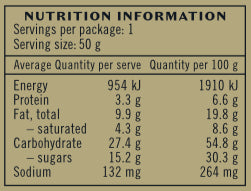 Apple Crumble Ingredients - Cereals 34.5% [flour, rolled oats, steel cut oats], Dried Apple 25% [apple puree (60%), apple juice (3.8%), sugar, humectant (glycerol), glucose syrup, acidity regulators (malic acid, sodium citrate), wheat fibre, gelling agent (pectin), antioxidant (ascorbic acid), flavours], Margarine [vegetable fat, water, salt, emulsifiers (471, 322), antioxidant (307b), food acid (330)], Golden Syrup, Chia Seeds, Flax Seeds, Brewers Yeast, Cinnamon, Emulsifier [soy lecithin], Salt